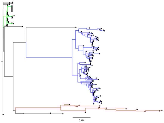 The phylogenetic tree of VP1 sequences in 157 iVDPV2 isolates. The sequence alignment was constructed using Clustal Omega, and the tree was inferred using the FastTree 2.1.10 [48] with the GTR model and gamma distribution and visualized with FigTree. Large genetic clusters of each case study are indicated by different colors, red for a chronic excretor in the United Kingdom 1995–2013 [45], blue for the environmental samples from Slovakia in 2003–2005 [43], and green for the stool and oropharyngeal samples from Israel in 2018 [46,47].