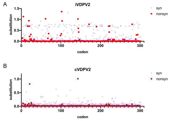 The frequency of synonymous and non-synonymous substitutions of the VP1 amino acid sequences from 157 iVDPV2 and 567 cVDPV2 isolates. Sequence divergence was analyzed using SNAP (Synonymous Non-synonymous Analysis Program, https://www.hiv.lanl.gov/content/sequence/SNAP/SNAP.html (accessed on 28 May 2021)) [54]. The synonymous (blue crosses) and non-synonymous substitutions (red circles) of the VDPV sequence relative to the Sabin 2 strain are depicted. (A) iVDPV2. (B) cVDPV2.