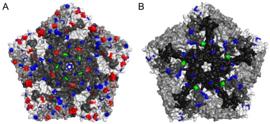 The locations of amino acid substitutions in selected iVDPV2 isolates. The three-dimensional structure of type 2 wild poliovirus strain MEF-1 was obtained from PDB 1EAH and represented as a pentameric unit ((A): outside; (B): inside of capsid). Each protomer contains a single copy of VP1, VP2, VP3, and VP4 distinguished by gray colors. The location of frequent amino acid substitutions (more than 4 out of 19 iVDPV2 isolates) relative to the Sabin 2 strain is colored. The neutralizing antigenic sites are red. The hypervariable residues and the gatekeeper substitution of VP1-143 are green. Other amino acid changes are blue. The image was generated using PyMOL 2.4.2 (Schrödinger).