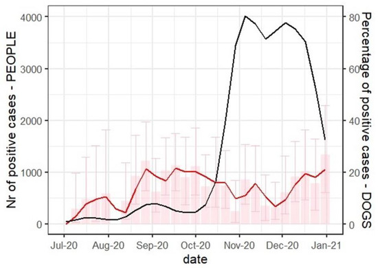 The weekly number of SARS-CoV-2 seropositive dogs and new q-RT PCR human cases in Zagreb from 1 July and 31 December 2020. The number of seropositive dogs is represented as a percentage of tested samples (red) and a two-week moving average trend line (red). Error bars are representing a 95% confidence interval. The number of new human SARS-CoV-2 infections in Zareb is publicly available [13] and here is represented as a two-week moving average trend line in black.