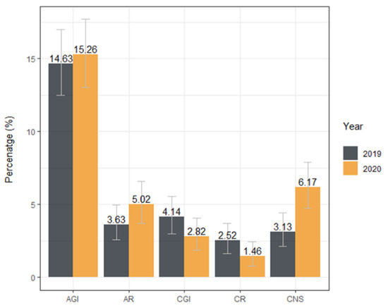 Prevalence of specific diagnosis at dogs admitted to the Veterinary Teaching Hospital in 2019 and 2020. Other diagnoses are not shown in this figure. Error bars represent a 95% confidence interval. AGI—acute gastrointestinal disorders, AR—acute respiratory disorders, CGI—chronic gastrointestinal disorders, CR—chronic respiratory disorders, CNS—central nervous system disorders.
