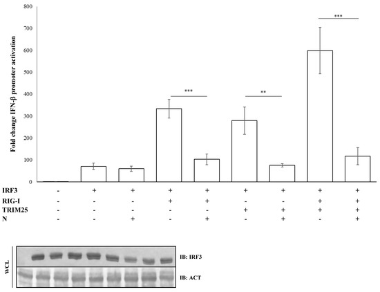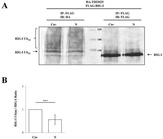 The activation of RIG-I is tightly controlled by its ubiquitination by the E3 ligase TRIM25 on lysine residues at the 172-position on the second RIG-I CARD domain [38,39]. To assess whether the N protein inhibitory activity was due to a direct effect on early RIG-I activation or on a downstream step in the cascade, an IFN-β reporter assay was performed in the presence of TRIM25 over-expression. The presence of TRIM25 significantly enhanced RIG-I signaling (2.4-fold induction; p = 0.0006) (Figure 2A, Table S2).