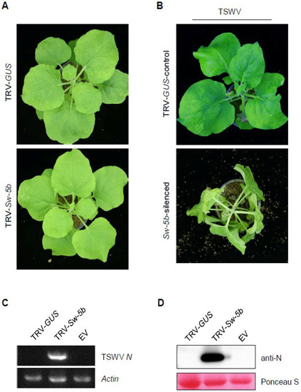 Mixed infection by two different viruses may have synergistic or suppressive effects. Our presented data are based on the use of TRV for gene silencing, followed by TSWV infection. We cannot rule out the possibility that infection of Sw-5b transgenic plants by TRV constructs may have enhanced or reduced the resistance to TSWV infection. In the future, gene knockout mediated by CRISPR/Cas9 in Sw-5b transgenic plant is needed to confirm the results obtained in this study.