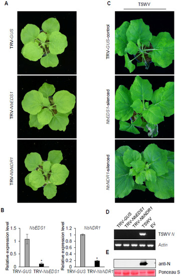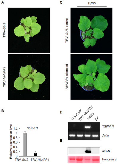Analysis of the requirement for NPR1 in Sw-5b-mediated resistance to TSWV. (A) TRV-NbNPR1- and TRV-GUS-treated Sw-5b transgenic N. benthamiana plants at 3 weeks post TRV agroinfiltration. (B) qRT-PCR analysis of the expression of NbNPR1 mRNA in newly emerged leaves of Sw-5b transgenic N. benthamiana plant treated with NPR1-silenced transgenic plants. The NbActin and NbEF1a genes were used as internal controls. Student’s t-test was used for statistical analysis (* p < 0.05). (C) Analysis of systemic infection of TSWV in Sw-5b-transgenic N. benthamiana plants silenced for NbNPR1. TRV-GUS plants were used as a control. The gene-silenced newly emerged leaves of Sw-5b-transgenic N. benthamiana plants were inoculated with TSWV. The photographs of treated plants were taken at 14 days post TSWV inoculation. (D) RT–PCR detection of TSWV N RNA in systemic leaves of Sw-5b-transgenic N. benthamiana plants silenced for NbNPR1 at 14 days post TSWV inoculation. A sample from TSWV-infected N. benthamiana tissues was used as a positive control. The NbActin gene was used as an internal reference gene. (E) Western blot analysis of TSWV N protein accumulation in the systemic leaves of Sw-5b-transgenic N. benthamiana plants silenced for NbNPR1 in panel C using specific antibodies against TSWV N. A plant sample expressed with p2300 empty vector (Vec.) was used as a negative control. Ponceau S staining was used as a protein loading control.