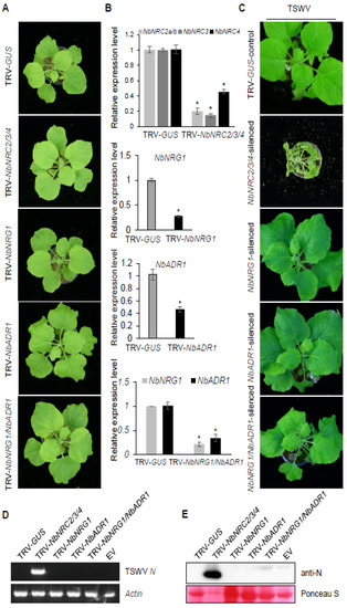 ADR1 and NRG1 play important roles in the regulation of ETI mediated by multiple NLRs [47,62]. To examine whether NRG1 and ADR1 are involved in Sw-5b-mediated resistance, we silenced NbNRG1, NbADR1, and both genes (NbNRG1/NbADR1) in Sw-5b-transgenic N. benthamiana plants using TRV-based VIGS. At 3 weeks post TRV treatment, the growth states of NbNRG1-, NbADR1-, and NbNRG1/NbADR1-silenced N. benthamiana plants were similar to that of TRV-GUS-treated plants (Figure 5A and Figure S6). The TSWV crude extract was inoculated onto the gene-silenced newly emerged plant leaves. At 14 days post TSWV inoculation, no systemic viral infection was found in systemic leaves of NbNRG1-, NbADR1-, or NbNRG1/NbADR1-silenced plants (Figure 5C). RT-PCR and Western blot assays confirmed the absence of TSWV in the systemic leaves of the NbNRG1-, NbADR1-, and NbNRG1/NbADR1-silenced plants (Figure 5D,E). These results imply that the helper NLRs NRG1 and ADR1 may not be involved in Sw-5b-mediated resistance.