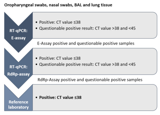 Workflow of molecular analysis applied. The extracted nucleic acids from all oropharyngeal swab samples (n = 1132), nasal swabs samples (n = 1125), bronchioalveolar lavage (n = 2), and lung tissue samples (n = 2) were run in the reverse transcriptase real-time polymerase chain reaction (RT-qPCR) targeting the viral envelope (E) gene. Positive and questionable positive samples were further analyzed by RT-qPCR targeting the RNA dependent RNA polymerase (RdRp) gene. If positive or questionable positive after both RT-qPCR assays, the results were confirmed by the reference laboratory of Switzerland, the Swiss Federal Institute of Virology and Immunology (IVI) and stated as positive if the cycle threshold (CT) values resulted ≤38.