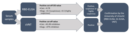 Positive control sera from four SARS-CoV-2 antibody-positive field cats were kindly provided by Dr. Herman Egberink and Dr. Els Broens, Faculty of Veterinary Medicine, University of Utrecht, The Netherlands. As a negative control, a serum sample from a specified pathogen-free (SPF) cat collected in 2017 was used (TVB ZH095/15, [33]). Sera submitted to the diagnostic laboratory from 24 Swiss cats for routine diagnostic purposes (remaining material) between 2 October 2017 and 4 January 2020 [30], and leftovers from sera from 24 dogs (TVB 72/11 and TVB 042/15 [34]) collected in 2013 and 2014, were run as pre-COVID-19 samples. The positive optical density (OD) cut-off value was calculated at six-fold standard deviations above the mean value of reactivity of all serum samples from the pre-COVID-19 cohort for cats [35]. For the dog samples, thresholds to categorize samples as suspicious and highly suspicious were set by the authors. In dogs, a positive control, which was collected as part of a research project investigating animals in COVID-19-affected households in Switzerland (TVB ZH062/20), was added. The control was confirmed as positive by the University of Utrecht. In all samples, a surrogate Virus Neutralization Test (sVNT) was performed, and in samples with positive, suspicious, and highly suspicious results, confirmatory assays were conducted at the University of Utrecht, as shown in Figure 2.