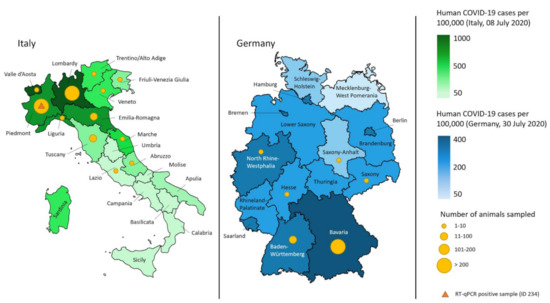 Geographical distribution of swab-sampled animals in comparison to the cumulative human COVID-19 cases per 100,000 residents per region (Italy and Germany). The number of sampled animals per region is shown by the size of the yellow dots, as indicated in the legend. The green and blue color gradient shows the number of cumulative human COVID-19 cases per 100,000. Most RT-qPCR-tested animals resided in Lombardy, Piedmont, and Bavaria. These regions showed the highest cumulative COVID-19 cases per 100,000 in the first wave of the pandemic in these two countries (data from 8 July 2020 and 30 July 2020). The RT-qPCR- positive cat (ID 234) lived in Piedmont (orange triangle); the questionable RT-qPCR positive dog (ID 213) lived in the same area (not indicated). Data source: Robert-Koch-Institute [40], COVID-19 dashboard, Dipartimento della Protezione Civile and ISTAT [14,41].