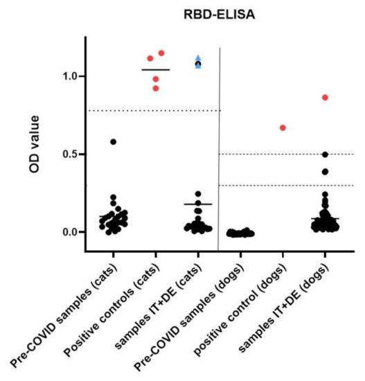 Results of receptor binding domain enzyme-linked immunosorbent assay (RBD-ELISA) on cat sera (left) and dog sera (right). Optical density (OD) values (measured at 415 nm) of cat samples and controls are indicated on the left half, and dog samples and controls are indicated on the right half of the figure. Samples that were confirmed as positive by the surrogate virus neutralization test (sVNT) and the University of Utrecht (S1 ELISA, S1-RBD ELISA, and pseudotyped VNT) are shown in red. The dotted line indicates the positive cut-off value for cats calculated as the six-fold standard deviation above the mean of pre-COVID-19 controls from cat sera (OD value 0.78). A positive cut-off value for dogs was not determined. Instead, samples with an OD value above 0.3 are described as suspicious, and above 0.5 as highly suspicious (dashed lines). One sample from a dog (ID 5) yielded a highly suspicious OD value of 0.86, and was confirmed to be positive by the sVNT and the University of Utrecht. Two sera collected in October and November 2020 from the RT-qPCR-positive cat (ID 234) are indicated as blue triangles (results were confirmed by sVNT and by the University of Utrecht).