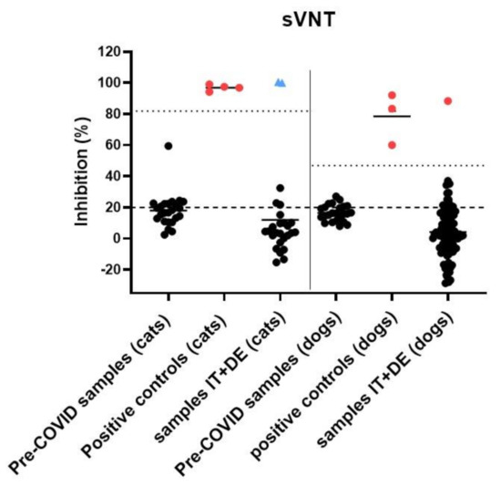 Surrogate virus neutralization test (sVNT) results on cat sera (left) and dog sera (right). The calculated inhibition is indicated as a percentage on the y-axis. The dotted lines show the positive cut-off value set for cat and dog samples, by calculating the six-fold standard deviation above the mean of pre-COVID-19 controls inhibition (81.8% in cats and 47% in dogs). The dashed line indicates the positive cut-off set, according to the manufacturer’s instructions, at 20%. Positive samples, which were also confirmed by the University of Utrecht, are shown as red dots. One dog (ID 5) showed neutralizing activity with an inhibition of 88.3%. The two samples collected from the RT-qPCR-positive cat (ID 234) in October 2020 with an inhibition of 99.9% and in November 2020 with an inhibition of 100.5% are indicated with blue triangles.