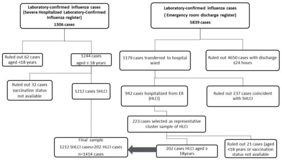 A total of 1529 (1306 SHLCI and 223 HLCI) cases were initially recorded: 115 cases were ruled out due to age <18 years (83 cases) or missing information on the vaccination status. Therefore, 1414 cases were included in the analysis: 465 (33%) were vaccinated cases of whom, 437 (94%) were aged ≥60 years, 269 (57.8%) were male and 295 (63.3%) had influenza type B. The influenza A subtype was available in 160 A cases (26.2%), of whom 90 (56.3%) were A (H1N1)pdm09 and 70 (43.7%) AH3N2.
