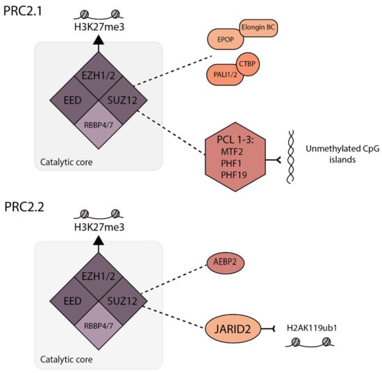 In addition to the core proteins, PRC2 is also associated with a variety of accessory proteins, and the mutually exclusive binding patterns give rise to two distinct PRC2 variants: PRC2.1 and PRC2.2 [] (Figure 1). The possible combinations of accessory proteins for a single PRC2 variant reflect the built-in complexity in regulating PRC2 activity. The PRC2.1 complex includes one of three polycomb-like (PCL) proteins (PCL1/2/3), also known as PHF1, MTF2 and PHF19, respectively, which enable PRC2.1 binding to unmethylated CpG islands []. In addition to PCL proteins, PRC2.1 contains Elongin BC and Polycomb repressive complex 2-associated protein (EPOP) or PRC2-associated LCOR isoform 1 (PALI1/2) [,,,]. In contrast, PRC2.2 contains Jumonji and AT-rich interaction domain 2 (JARID2), and adipocyte enhancer-binding protein 2 (AEBP2), which together recruit PRC2.2 to the H2AK119ub1 modification and permit the PRC2 methyltransferase activity to overcome the repressive effects of active histone modifications H3K4me3 and H3K36me3 [,,,]. Although the differential activities of PHF1/PHF19/MTF2 and JARID2 contribute to the recruitment of PRC2.1 and 2.2 to different regions of chromatin, there are also redundant or compensatory mechanisms observed for PRC2.1 and PRC2.2 and inhibition of both complexes is required for the full inhibition of PRC2 activity in pluripotent cells []. It should also be noted that studies of PRC2.1/2.2 function on cellular chromatin have been carried out with some residual epigenetic template. In addition, it is likely that there are differences in the resulting epigenetic structures when fHC is laid down by PRC2.1 versus PRC2.2 that could result in different mechanisms for the re-expression of genes. This is also supported by a recent study that has uncovered subtle differences in PRC2.1 versus PRC2.2 by inducing mutations in SUZ12 to shift preference towards forming one complex over the other. This revealed that PRC2 occupancy was significantly higher for PRC2.1 target regions than PRC2.2 bound regions, suggesting that differential accessory proteins bound to either PRC2.1 or 2.2 can result in differing PRC2 occupancy levels, at least in human iPSCs []. Whether this has long-term implication for gene expression and chromatin compaction is not known. In addition, as gene expression patterns change during differentiation, there is evidence that PRC2.2 is important for de novo silencing during this transitional process, whereas MTF2-containing PRC2.1 was required to maintain high amounts of H3K27me3 at already repressed CpG dense promoters []. These results do not conflict with findings of redundancy between PRC2.1 and PRC2.2 in mESCs [,], instead suggesting that, during differentiation, their roles shift.