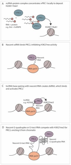 - Davidovich, C.; Cech, T.R. The recruitment of chromatin modifiers by long noncoding RNAs: Lessons from PRC2. RNA 2015, 21, 2007–2022. [Google Scholar] [CrossRef] [PubMed]