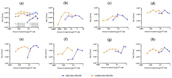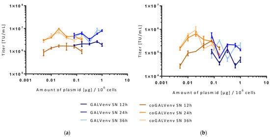 To determine whether codon optimization has the same effect on the production of γ-RVVs and α-RVVs as on LVVs, a new vector preparation was conducted. Generally, based on preliminary results and published data on optimal plasmid concentrations [,] we used the same experimental setup for vector preparation as shown for LVVs, i.e., multiple parallel vector productions with increasing amounts of GALV-env and coGALV-env and three times for harvest of supernatants. During vector production, it was interesting to note that the 293T cells producing α-RVVs were less attached to the surface of the tissue culture dish than those cells producing γ-RVVs. Unexpectedly, for both γ-RVVs and α-RVVs, vector productions with standard GALV-env did not reveal distinct optima of plasmid amounts, but titration curves showed rather wave-like shapes. Nevertheless, vector titers were in the expected range for both vector types (107 transducing units [TU]/mL for γ-RVVs and 106 TU/mL for α-RVVs), independent of the used env plasmid (GALV-env or coGALV-env). Most importantly, for both vector systems, maximal titers were again obtained with lower (approximately 8–10 times) plasmid amounts of coGALV-env (20 ng of plasmid/106 293T cells) as compared to standard GALV-env (Figure 3).