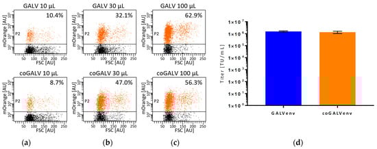 Titers of lentiviral LeGO-mOrange2 vectors produced in standard-scale with GALV-env and coGALV-env. GALV-env-vectors were produced in triplicates with 640 ng of plasmid/106 cells, coGALVenv-vectors with 20 ng of plasmid/106 cells. (a–c) Exemplary dotplots of transduced primary human T cells for three different amounts (10, 30, 100 µL) of vector-containing supernatant produced with GALV-env or coGALV-env. Clear-cut separation of transduced vs. non-transduced cells even in demanding cells facilitates unequivocal determination of transduction rates indicated; (d) Means and standard deviations of titer determination performed in triplicates. No significant difference in titers as measured on 293T cells was seen by t-test. FSC = forward scatter, AU = arbitrary units of area signal.