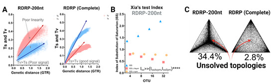 Evaluation of the homoplasy signal and phylogenetic noise. (A) Scatter plot representation of transitions and transversions versus the genetic distance calculated using the GTR model implemented in DAMBE [19], comparing RdRp-200 to full-length RdRp. Transition values are denoted with blue circles and transversion values with red squares. (B) Xia’s test [20,43] was performed on the 403 sequences for the RdRp-200 marker. DAMBE randomizes sequences in subsets of 4, 8, 16, and 32 OTUs multiple times to perform the test. The index of substitution saturation (ISS), defined as the ratio between the mean entropy of aligned sequences (H) versus the entropy of sequences assuming full saturation (HFSS), is represented by blue triangles (see expression (2), (3), and (5) in Xia et al.) [20]. The index of the critical substitution saturation (ISS.c), defined as the value at which the sequences will begin to fail to recover the true topologies for both symmetric and asymmetric trees, are represented by orange circles and red rectangles, respectively, (**** significant differences p < 0.0001). (C) Evaluation of phylogenetic noise by maximum-likelihood mapping for both RdRp-200 and RdRp-complete phylogenetic markers. Dots located at triangle vertices represent posterior probabilities of unrooted topologies in each quartet; the percentage of unsolved topologies noted for each corresponds to an estimation of phylogenetic noise.