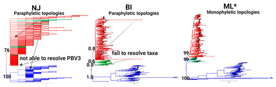 Phylogenetic tree topology comparison for classification of PBV. Tree topologies of the RdRp complete coding sequences obtained by neighbor joining (NJ; left), Bayesian inference (BI; middle), and maximum likelihood (ML; right) analyses are shown. Three main PBV lineages resolved are denoted by color (PBV1: red, PBV2: blue, and PBV3: green) with support for external nodes indicated by bootstrap/posterior probability values. Characteristics (monophyletic or paraphyletic) of each tree are indicated and the best topology supported by all statistical methods deployed (see the Materials and Methods) is denoted with an asterisk. Refer to Table 2 for the results of the tests.
