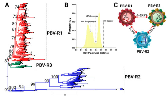 PBV has not been isolated in culture, nor are there serotypes, etc., to distinguish strains. The International Committee on the Taxonomy of Viruses (ICTV) has endorsed, among other phylogenetic and biological criteria, the use of genome-wide nucleotide or amino acid sequence identity thresholds for the classification of novel virus isolates.. Complete RdRp sequences segregated into three lineages, which based upon pairwise genetic distances, we determined are unique species of PBV. The idea that PBVs genogroups I and II diverged into different genera has been suggested in recent studies [3,4,16], however, our results rejected this hypothesis. The frequency of pairwise distributions obtained for both segments using all the complete sequences available at the GenBank revealed a homogeneous distribution, lacking additional peak(s) at greater genetic distances that would indicate the differentiation of PBVs at this major taxonomic level [22,39,51]. PBV-like strains utilizing the mitochondrial genetic code may be from another genus, however, we excluded these from our analysis [10,48]. Future studies are necessary to determine where these fit on the evolutionary tree. PASC analysis further classified taxa within these species into multiple genotypes and subgenotypes. While prior classification into two genogroups was warranted based on the genetic distances calculated across the 200 nt RdRp segment, we demonstrated unequivocally that this marker is under homoplasy and should be avoided. The majority of RdRp sequences are found in PBV-R1, yet the greatest genetic diversity is found in PBV-R2 with eight genotypes. We note that PBV-R3 now resolves from PBV-R1 when using full-length sequences, a pattern that has been demonstrated but not described by others [52]. In spite of this speciation pattern, there does not appear to be evidence of virus–host coevolution or a host restriction at any classification level.