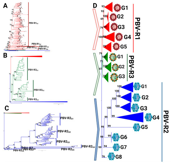Using the threshold values determined by PASC analysis (Figure 4B), subdivisions of each species were explored further. Within PBV-R1 we identified 12 statistically supported internal nodes (bootstrap values ≥ 60%; Figure 5A, Table S3), in which genetic distances between them only exceeded 40% for five groupings. Therefore, we defined these five groups as genotypes G1-G5: they are denoted with red dots on the tree, correspond to the red peak in the PASC distribution, and have red cells in the adjacent table (Figure 5A). The remaining seven clusters with pairwise distances below this cutoff (depicted in grey) could constitute subgenotypes, however, we did not pursue further classification at this taxonomic level. We highlight the fact that the branching pattern for PBV-R1G1 exhibits a higher diversity than the remaining genotypes within the PBVR1 species. PBV-R2 and PBV-R3 species were similarly assessed to determine divergence patterns. For PBV-R2, 8 genotypes (denoted in blue) out of 11 groups were identified, while for PBV-R3 only 3 genotypes (denoted in green) out of 6 groups were recognized (Figure 5B,C, Tables S4 and S5). The proposal for the classification of PBV RdRp is summarized in Figure 5D.