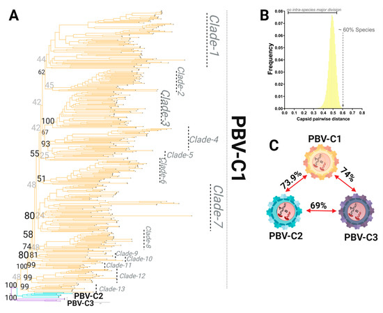 PASC analysis was then applied to 422 capsid sequences following ML tree reconstruction (Figure 6A). As with RdRp, we observed three major capsid lineages obtained from the ML topology using MAFFT alignment (for the best topology yielded see Table 3 and Table 4). However, unlike RdRp, the majority of capsid sequences populated one lineage of the phylogenetic tree, denoted here as PBV-C1. In addition, the PASC analysis distribution was characterized by only one peak, with pairwise genetic distances ranging from 40–60% (Figure 6B; Supplemental Figure S2). This pattern illustrates the lack of internal taxonomical division. Sequences were grouped based on the lineages derived from the phylogenetic tree in order to calculate genetic distances. With genetic distances higher than 60% obtained for all the three main lineages, it was again revealed with the capsid segment that the PBV genus has diversified into three different species. We denote these here as PBVC1-PBVC3 (Figure 6). PASC distribution and the current number of capsid sequences available did not support further classification at the level of the genotype or subgenotype. Thus, the phylogenetic divisions observed within the PBV species C1 (PBVC1) were defined as clades, with a total of 13 clades identified in the current dataset (Figure 6A).