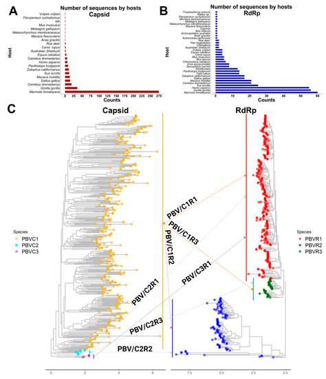 Full-length capsids were also classified into three species, however PASC analysis indicates there were not statistically supported subdivisions therein, only clades in PBV-C1. The lack of observed genetic diversity in capsid may be a reflection of incomplete or biased reporting. Indeed, the vast majority of capsid sequences in GenBank are from Marmota himalayana, whereas for RdRp there is a greater balance of vertebrate entries (Figure 7A,B). An alternative hypothesis is that host selective pressure has placed limits on diversification, ensuring a broadness that accommodates encapsidation of any RdRp while permitting viral entry into a myriad of diverse hosts [53]. For these reasons, we speculated that the capsid segment was acquired later than RdRp following independent reassortment events.