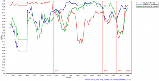 The S gene of CalEnt was submitted to the basic local alignment search tool (BLAST, blast.ncbi.nlm.nih.gov, accessed on 20 July 2021) and the whole S gene from sequences showing the highest homologies was aligned using the MAFFT plugin [17] in Geneious Prime 2020.1.1. The alignment was uploaded in SimPlot, which compares the percent identity of the S gene of CalEnt to other sequences and plots the identities versus the nucleotide positions [19].