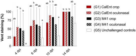 Percentage of commercial broilers presenting vent staining after a challenge with either IBV M41 or CalEnt oculonasally or via crop gavage. Different superscripts represent statistical significance (p < 0.05). Same letters represent no statistical difference (p > 0.05). Groups were compared using Kruskal–Wallis (for non-parametric data) followed by Dunn’s multiple comparison tests.