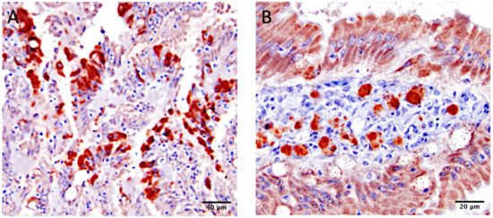 Infectious bronchitis virus antigen detection in intestinal sections of broilers challenged with CalEnt by immunohistochemistry (IHC): (A) IBV IHC staining in the cytoplasm of enterocytes from CalEnt-infected chickens at 4 dpi via oculonasal route. Scale bar = 40 µm; (B) IBV IHC staining in the cytoplasm of lymphocytes of the intestinal lamina propria from CalEnt-infected chickens at 14 dpi via oculonasal route. Scale bar = 20 µm.