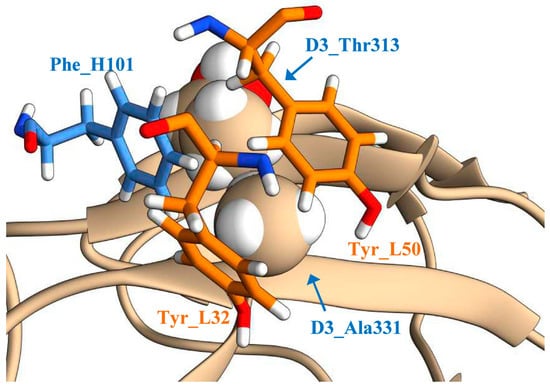 The structure of the antibody−antigen interface adjacent to the Ala331 residue of the D3_Sof protein: The amino acid residues Tyr_L32 and Tyr_L50 of the light chain are shown in orange; the amino acid residue Phe_H101 of the heavy chain of the ch14D5 antibody is shown in blue; part of the D3_Sof protein is shown in tan.