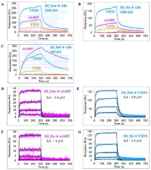 As expected, the affinity of certain mutant variants (namely Y32Q, Y50H, Y50Q, F101L, F101M, and F101Q) to D3 proteins markedly decreased, as no significant binding was observed. However, antibodies Y32M, Y32H, and sc14D5 effectively bound to these proteins. Moreover, the affinity of the Y32M variant for the D3_Zau and D3_Eu proteins was 2.2 times higher than that of the original antibody sc14D5 (Figure 2). This can be seen by the direct measurement of the affinity constants (Figure 2D,G). The range of concentrations used for the D3 proteins in experiments (Figure 2D,E,G) was appropriate because the calculated affinity constants fell within this range. In the case of the interaction of the D3_Eu protein with the sc14D5 antibody (Figure 2F), the calculated affinity constant was outside this range, but the estimate of Kd > 6 μM is sufficient.