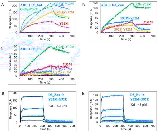 Binding of mutant antibody variants Y32M-G91F, Y32M-G91W, Y32M-G92E, Y32M-G92W, Y32M-G92Y, Y32M-G100W, Y32M-G100Y, and Y32M-A102W to D3 proteins: (A–C) E. coli periplasmic extracts containing antibody variants were used for screening at approximate antibody concentration of 100–200 nM (as estimated by the intensity of the corresponding bands on the gel electrophoregram). The G92F-Y32M antibody trace is shown in purple. (D,E) Measurement of affinity constants. Threefold dilutions of purified D3 proteins were used starting from 3.24 μM concentration. Experimental curves are shown by colored lines, approximations are shown in black. The analysis was carried out using a ProteOn XPR36 biosensor.