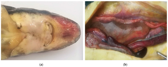 Russian sturgeon from farm 8 showing clinical signs: (a) haemorrhage on the rostrum (b) splenomegaly, intestinal haemorrhage and swim bladder filled with yellowish fluid.