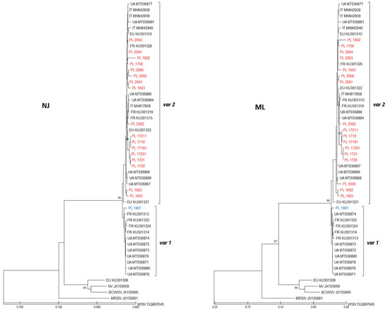 Analysis of the partial mimivirus major capsid protein (MCP) sequences using the neighbor-joining (NJ) and maximum-likelihood methods (ML). For each sequence, the country of origin is indicated (two-letter country code: PL—Poland; UA—Ukraine; IT—Italy; FR—France; EU—other European countries). Polish isolates are marked in blue (var1) and red (var2). Bars indicate the scale of genetic distance between sequences.
