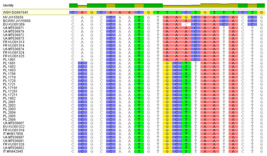 During both analyses and on the ML and NJ phylogenetic trees, Polish sequences, together with other Europeans available in the GenBank database, were grouped into two genogroups that are correlated with the allele type of variant 1 or variant 2 in the MCP protein as described by Pallandre and co-authors [20,21] as var1 or var2 (Figure 3). The first genogroup included sequences with a var1 motif from France and Ukraine and only one sequence from Russian sturgeon from Poland (PL1801). Within this group, the Polish sequence was quite divergent from Ukrainian and French. In the second genogroup, all the sequences had a var2 motif and the Polish sequences were almost identical to sequences from other countries. In this group, the isolates PL1719-PL17211 had the least divergence and came from sick fish from farm 5 associated with the outbreak of mimivirus and increased mortality. In general, mimivirus infection was confirmed in six out of nine farms, with var2 occurring more frequently in fish than var1. Only one sequence from A. gueldenstaedtii (PL1801) had one single nucleotide polymorphism (SNP) difference in terms of sequence characteristic for strains closely related with American isolates (var1 AAACAATA) [20,21]. All the remaining sequences were assigned to the European variant (var2 GCTTAATA), including sample PL1802 from the same farm and species as PL1801 (Figure 4). The presence of different virus variants in one batch of the same farm confirms the existence of variants independently of one another.