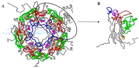 (A)—Pentamer of VP1 protein, (B)—monomer of VP1. Model based on the sequence obtained and deposited (5fua.1) by []. Loop location visualized based on []. BC loop–57-89aa–red, DE loop–129-147aa–blue, EF loop–157-218–green, GH loop–247-257aa–orange, HI loop–268-277–magenta. Visualization was prepared in Rasmol Software. Adapted from [].