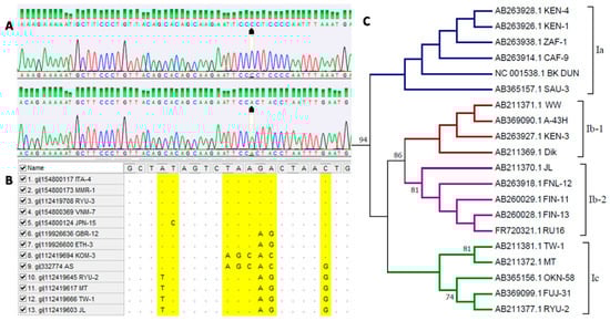 Bioinformatic analysis of BK polyomavirus sequences including (A) analysis of chromatograms representing sequences belonging to BKPyV genotypes I and IV (analysis performed in DNA Baser software), (B) preparation of sequence alignment from databases representing different virus genotypes, (C) analysis of phylogenetic relationships between virus subtypes within genotype I (analysis performed in MEGA 6 software). Own results.