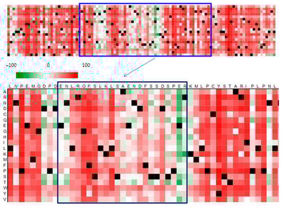 Prediction of functional effects of mutations in the amino acid sequence of the VP1 protein with a BC loop region (in frame) prepared in the SNAP2 application, showing polymorphic amino acids in relation to the DUN strain. Dark red indicates a high score (score > 50, strong signal for effect), white indicates weak signals (−50 < score < 50) and green a low score (score < −50, strong signal for neutral/no effect). Black designates the corresponding wild-type residues. Own results.