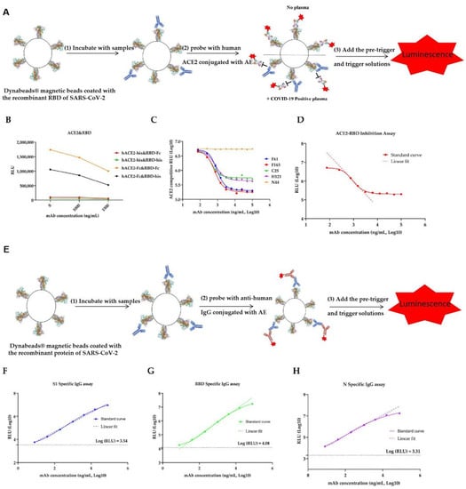 Dynabeads® magnetic beads (purchased from Thermo Scientific, Waltham, MA, USA) were coated with the recombinant RBD of SARS-CoV-2 through cross linking by N-ethyl-N® (3-dimethylamino-propyl) carbodiimide (purchased from Thermo Scientific). Human ACE2-hFc and human ACE2-8×his were conjugated with acridinium ester (AEs were purchased from Xiamen Heliosense Company, Xiamen, Fujian, China), and the conjugated ACE2 were then purified by column filtration on a GE PD-10 column. The calibrators were made from monoclonal antibodies targeting SARS-CoV-2 RBD with designated concentrations (ng/mL). The pre-trigger and trigger solutions are composed of sodium hydroxide and hydrogen peroxide. All measuring procedures were established based on the ACL2800 automatic chemiluminescent analyzer provided by Nanjing DGNS Biotech Co., Ltd. (Nanjing, Jiangsu, China). The correlation between the chemiluminescent signal measured as relative light unit (RLU) and the concentration of SARS-CoV-2 IgG is shown in the Standard curves. In Figure 1, A is reported the graphic representation of ACE-RBD inhibition assay (Figure 1A).