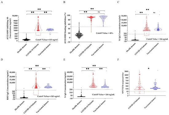 ACE2-RBD-inhibiting antibody, SARS-CoV-2 specific IgG and microneutralization test results of 119 convalescent samples, 86 vaccinated samples and 299 health control samples. (A) ACE2-RBD-inhibiting antibody concentration. (B) ACE2-RBD binding inhibtion. (C) S1-IgG. (D) RBD-IgG. (E) N-IgG concentrations. (F) Neutralizing antibody titer of 119 convalescent samples, 86 vaccinated samples, and 299 health control samples were measured using CLIA and MNT. The 119 convalescent samples results are shown as red dots, the 86 vaccinated samples results are shown as blue dots, and the 299 health control samples results are shown as black dots. Dashed lines represent the cutoff for positive sample designation, determined by ROC curve. Results between each paired groups were analysis by t test, and means significant differences between two groups were shown as ** (p < 0.01) and * (p < 0.05). No significant difference was shown as ns, p > 0.05.