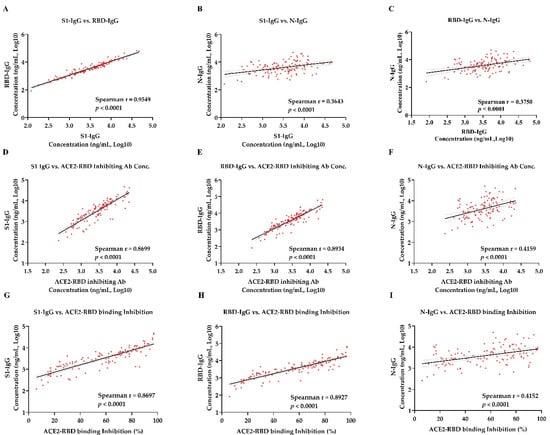 Spearman correlation was used to analyze the correlation between antibody concentrations in sera samples from patients in the convalesce period of COVID-19 (Table 1) and vaccinated donors (Table 2). There was a strong correlation between the concentration of S1-IgG antibody and RBD-IgG antibody in COVID-19 convalescent sera (r = 0.955, p < 0.0001) and vaccinated sera (r = 0.983, p < 0.0001) (Figure 3A and Figure 4A). However, a moderate correlation was observed between S1-IgG assay and N-IgG assay (r = 0.3643 for convalescent sera and r = 0.495 for vaccinated sera, p < 0.0001) (Figure 3B and Figure 4B). So as to the correlation between the concentration of RBD-IgG antibodies and N-IgG antibodies, with r = 0.375 for convalescent sera (Figure 3C) and r = 0.478 for vaccinated sera (Figure 4C), respectively. Strong correlations were observed between the ACE2-RBD inhibition assay and anti–SARS-CoV-2 S protein IgG assay. ACE2-RBD binding inhibition rate were strongly correlated with the concentration of S1-IgG antibody, with the r = 0.8697 for convalescent sera (Figure 3D) and r = 0.9412 for vaccinated sera (Figure 4D), respectively. There was significant correlation between the concentration of the ACE2-RBD inhibitory antibody and S1-IgG antibody, with the spearman coefficient of 0.8699 for the convalescent sera (Figure 3G) and 0.9411 for the vaccinated sera (Figure 4G), respectively. Similarly, ACE2-RBD binding inhibition rate were strongly correlated with the concentration of RBD-IgG antibody. The spearman coefficient for COVID-19 convalescent sera and vaccinated sera were 0.8927 (Figure 3E) and 0.9413 (Figure 4E), respectively. The spearman coefficient between ACE2-RBD inhibiting antibody concentration and RBD-IgG antibody concentration were 0.8934 for convalescent sera (Figure 3H) and 0.9414 for vaccinated sera (Figure 4H). However, there was a moderate correlation between ACE2-RBD-inhibition assay and N-IgG antibody concentration. The spearman coefficient between the ACE2-RBD binding inhibition percentage rate and N-IgG antibody concentration for COVID-19 convalescent sera and vaccinated sera were 0.4152 (Figure 3F) and 0.4674 (Figure 4F). The spearman coefficient between ACE2-RBD inhibiting antibody concentration and N-IgG antibody concentration were 0.4159 for convalescent sera (Figure 3I) and 0.4674 for vaccinated sera (Figure 4I).
