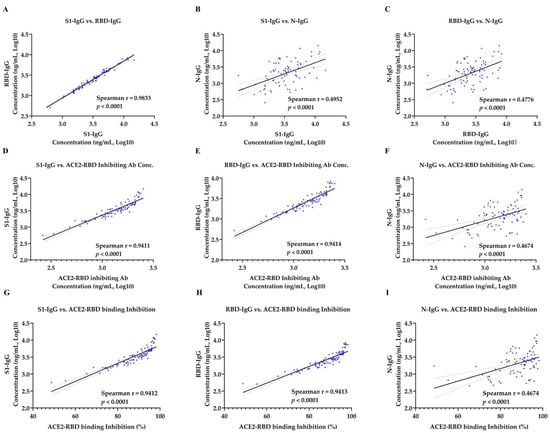 Correlation of ACE2-RBD inhibition assay and SARS-CoV-2 specific IgG concentration tests in 86 vaccinated samples. (A) Correlation of S1-IgG and RBD-IgG. (B) Correlation of S1-IgG and N-IgG. (C) Correlation of RBD-IgG and N-IgG. (D–F) Correlation of ACE2-RBD inhibiting antibody concentration and S1-IgG, RBD-IgG, and N-IgG. (G–I) Correlation of ACE2-RBD binding inhibition were computed by nonparametric spearman correlation. Spearman r > 0.7 and p value < 0.05 indicate a strong correlation, Spearman r < 0.7 and p value < 0.05 indicate a weak correlation, while p value > 0.05 indicate no correlation. The solid line represents a linear regression, with 95% confidence intervals represented by dotted lines.