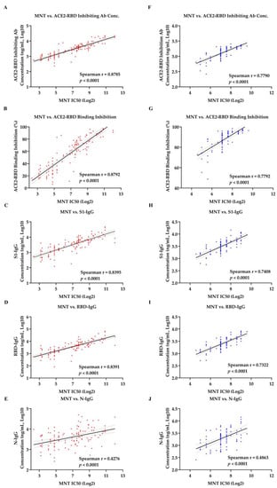 Correlation among microneutralization test (MNT), ACE2-RBD inhibition assay or SARS-CoV-2 specific IgG tests in samples. Correlation of 119 convalescent samples (A–E) and 86 vaccinated samples (F–J) test results were computed by nonparametric spearman correlation. (A,F) Correlation of MNT and ACE2-RBD inhibiting Antibody concentration. (B,G) Correlation of MNT and ACE2-RBD binding inhibition. (C,H) Correlation of MNT and S1-IgG. (D,I) Correlation of MNT and RBD-IgG. (E,J) Correlation of MNT and N-IgG. Spearman r > 0.7 and p value < 0.05 indicate a strong correlation, Spearman r < 0.7 and p value < 0.05 indicate a weak correlation, while p value > 0.05 indicate no correlation. The solid line represent a linear regression, with 95% confidence intervals represented by dotted lines.