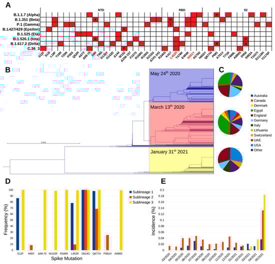 Phylogeny and distribution of lineage C.36. (A) Spike amino acid mutations associated with the currently most relevant VOC and VOI. Mutations associated with increased affinity are highlighted in red. (B) Phylogram of C.36 spike amino acid sequences deposited on GISAID before 18 May 2021, with sublineage 1, 2, and 3 highlighted in blue, red, and yellow, respectively. For each sublineage, the first sampling date is reported. (C) Geographic distribution of the three sublineages. (D) Spike amino acid mutations most frequently associated to each C.36 sublineage. (E) Sublineages global monthly incidence normalized by the total number of sequenced isolates over the same period.