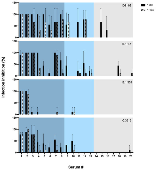 Neutralization assay. Neutralizing activity was assessed using two sera dilutions (1:80 and 1:160) against 0.01 MOI of four SARS-CoV-2 variants: D614G (black), B.1.1.7 (blue), B.1.351 (orange), C.36 (green). Mean values + SD are reported, each condition was tested in triplicate. Sera are ordered according to the anti-RBD titer and reported in blue, light blue and grey for titer >2500 U/mL, 2500–1000 U/mL or <1000 U/mL, respectively.