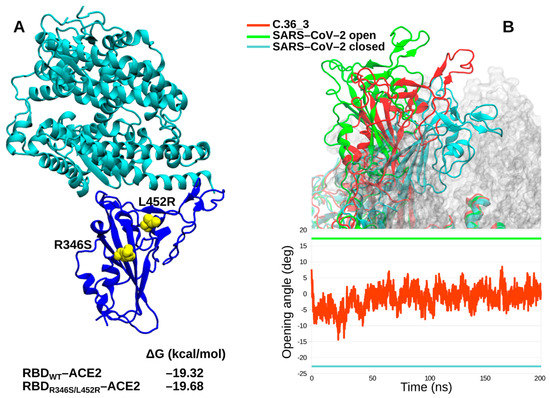 We further characterized in silico the C.36_3 Spike in terms of its RBD affinity for ACE2 and its ectodomain dynamics. Affinity calculations did not show any obvious difference between the wild type RBD and the R346S/L452R double mutant (Figure 3A). Intriguingly, the spike dynamics showed a lower average exposure of the RBD compared to ancestral SARS-CoV-2 cryo-electron microscopy structures (Figure 3B). Therefore, from our simulations, we identified C.36_3 spike structural features compatible with a shift towards a more closed conformation that suggest a higher global protection of RBD neutralizing epitopes. At the same time, we do not envision a higher fitness due to these global features and an unaltered affinity for ACE2.