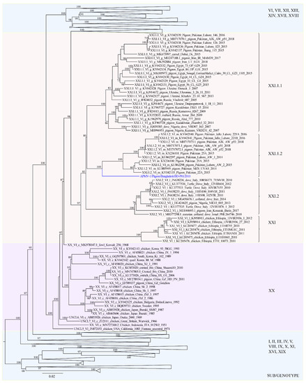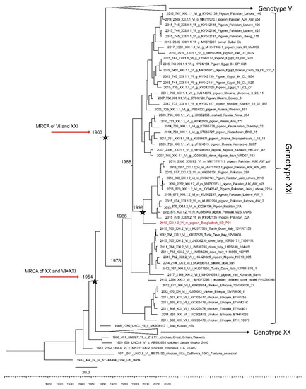 - Barman, L.R.; Nooruzzaman, M.; Sarker, R.D.; Rahman, M.T.; Saife, M.R.B.; Giasuddin, M.; Das, B.C.; Das, P.M.; Chowdhury, E.H.; Islam, M.R. Phylogenetic analysis of Newcastle disease viruses from Bangladesh suggests continuing evolution of genotype XIII. Arch. Virol. 2017, 162, 3177–3182. [Google Scholar] [CrossRef]