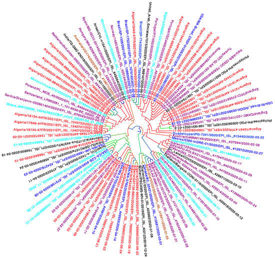 Our estimations regarding the MRCA of the SARS-CoV-2 Algerian pandemic under a relaxed molecular clock with the skyline model was 28 January 2020 [29 October 2019, 29 February 2020]. These results are coherent, as the restriction measures in Algeria began in mid-March 2020 [6]. The evolutionary rate of the SARS-CoV-2 pandemic in the present study was equal to 5.4043 × 10−4 substitution/site/year as of March 2021. In parallel, the substitution rate previously reported early in the pandemic was 1.66 × 10−3 in February 2020, whereas 8.99 × 10−4 in early August 2020, which is in line with the time-dependent pattern of substitution rates observed in viruses [2,42,43,44].