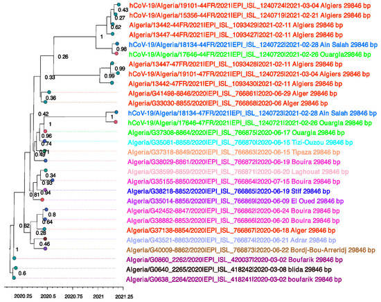 Maximum clade credibility tree. A Bayesian phylogenetic tree reconstructed using twenty-nine Algerian genomes. Posterior probabilities are indicated at each tree node. Branches are time-scaled in decimal years. Sequences are colored according to their sampling location.