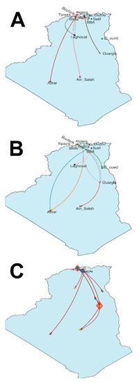 Likewise, to explore the spread of the SARS-CoV-2 in Algeria, both discrete and continuous approaches were used. Considering the discrete phylogeographic analysis, while relying on the Bayesian stochastic search variable selection /BSSVS and Bayes factor calculation, 14.1 non-zero-rates between cities were identified [95% HPD = 14–16], of which twelve were well-supported migration rates (BF > 3) (Figure 3A). The transmission route started from Boufarik towards Blida and Bouira, then from Bouira to Adrar, Algiers, Setif, Ouargla, El Oued and Tipaza, after that, from Ourgla to Tizi Ouzou. Setif to Laghouat, subsequently from Adrar to Bordj Bou Arreridj, and finally, from Bouira to Ouargla and Ouargla to Ain Salah (Figure 3B). In parallel, a continuous dispersion model was employed to get a more detailed overview regarding the diffusion process based on the reconstruction of the ancestral viral location coordinates assumed from the latitude and longitude of the sampling locations. The estimated diffusion rate was 1620.3 km/year. The root coordinates corresponded to Bouinan in Blida. In parallel, the transmission route started from Blida to Boufarik and back to Blida, following this, Bouira to El-Oued, Tizi Ouzou, and Tipaza, then from Bouira to Sétif, Laghouat, and Adrar, thereafter Bouira and Algiers towards Ouargla, and from Ouargla to Ain-Salah (Figure 3C).
