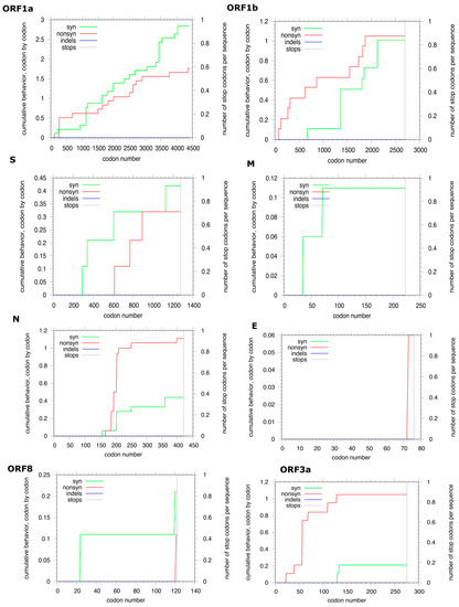 Cumulative behavior of synonymous and non-synonymous substitutions along each of the eight analyzed genes. Accumulation of amino acid substitutions for nineteen sequences comprising the SARS-CoV-2 reference sequence and eighteen complete genomes originating from Algeria are plotted. The x-axis represents codons for the entire coding region of each gene. The y-axis refers to the number of substitutions. The plot for synonymous substitutions is in red, while green depicts the non-synonymous substitutions. The grey vertical lines indicate stop codons.